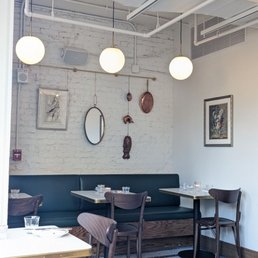 We walked in and were immediately greeted by the biggest smiles from the hosts. The downstairs is this beautiful space with a really cool bar. It feels a bit more casual, but very cool. We were taken upstairs where the decor was immaculate- beautiful greens and golds - very cozy, which is perfect for a French dinner! Our waiter was lovely and explained the prix fixe menu to us and we then began our dinner journey. They automatically bring out bread, Comte, oysters, and chickpea chips - all delicious. We then ordered the escargot (my first time and so good!), beets w/ goat cheese, gnocchi, zucchini tagliatelle w/ crab, and charred octopus. Every single dish was amazing - and what's better is the woman who brought each dish over told us how to have the perfect bite! It was such an experience. For our mains we shared the two options they gave (each dish feeds two people). The chicken was tender and had a savory mushroom jus - really lovely. The Chesapeake Striped Bass en Croute stole the show for the main course. It was flakey, perfectly seasoned, and came with the most amazing spiced sauce choron. We needed the meal with their cherry inspired desserts, both terrific. They also brought out a pistachio ice cream with fig sauce for my husbands birthday that was my favorite dessert! As we left, my mother said "I think that's one of the best meals I've ever had in my life!" Kudos to the entire team at Petite Cerise! Can't wait to try brunch soon!
